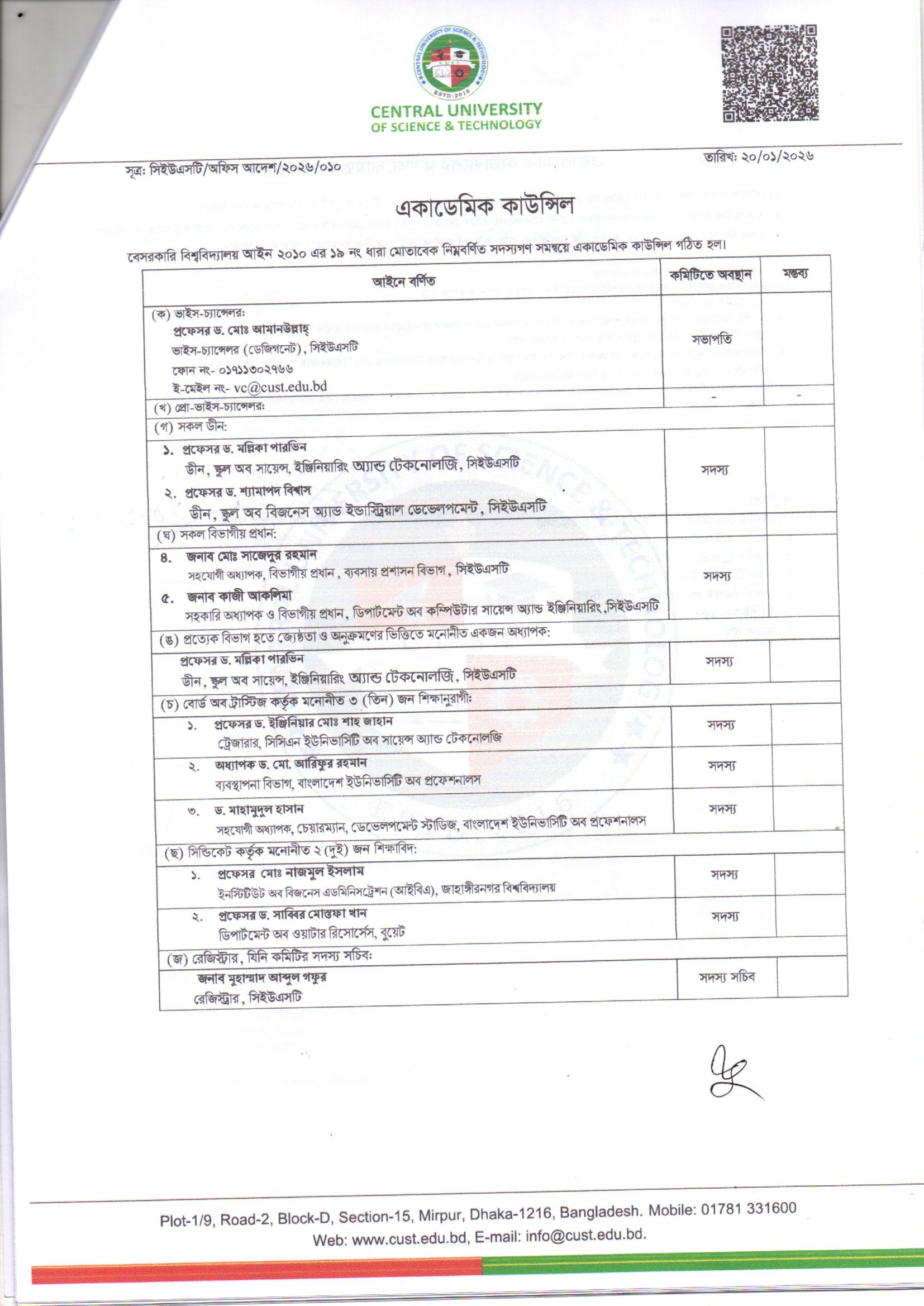 As per the Private University Act 2010 under article 19, The Academic Council is the principal authority of Academic activities of the University. The Academic Council recommends the educational policies of the University and also determines the curricula and courses that can help achieve high educational standards. The council is currently composed of the following academics and professionals: