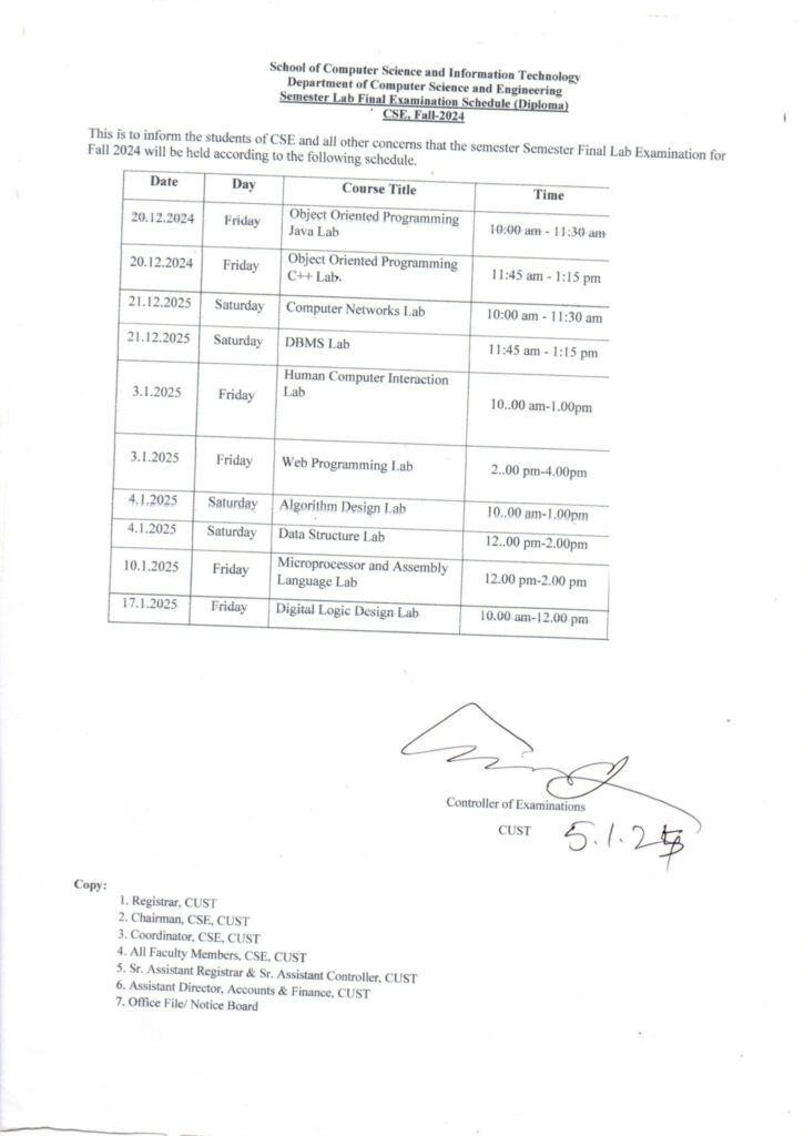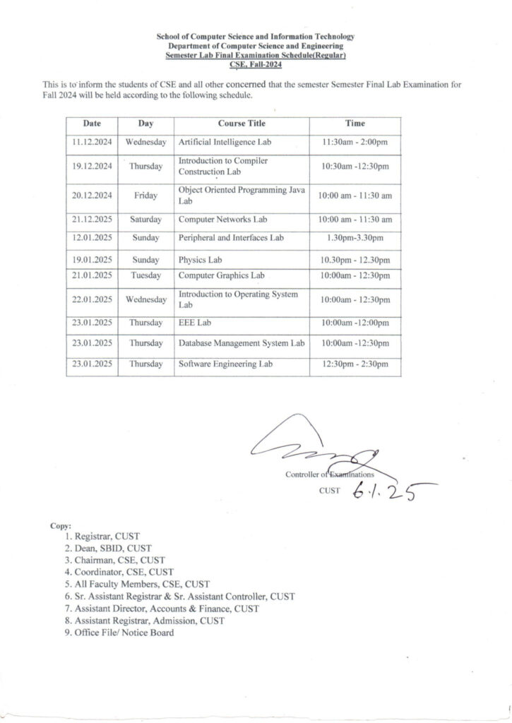Final Examination (Lab) Schedule for CSE Program, Fall-2024 December 10, 2024 | Notice . Notice - Computer Science & Engineering