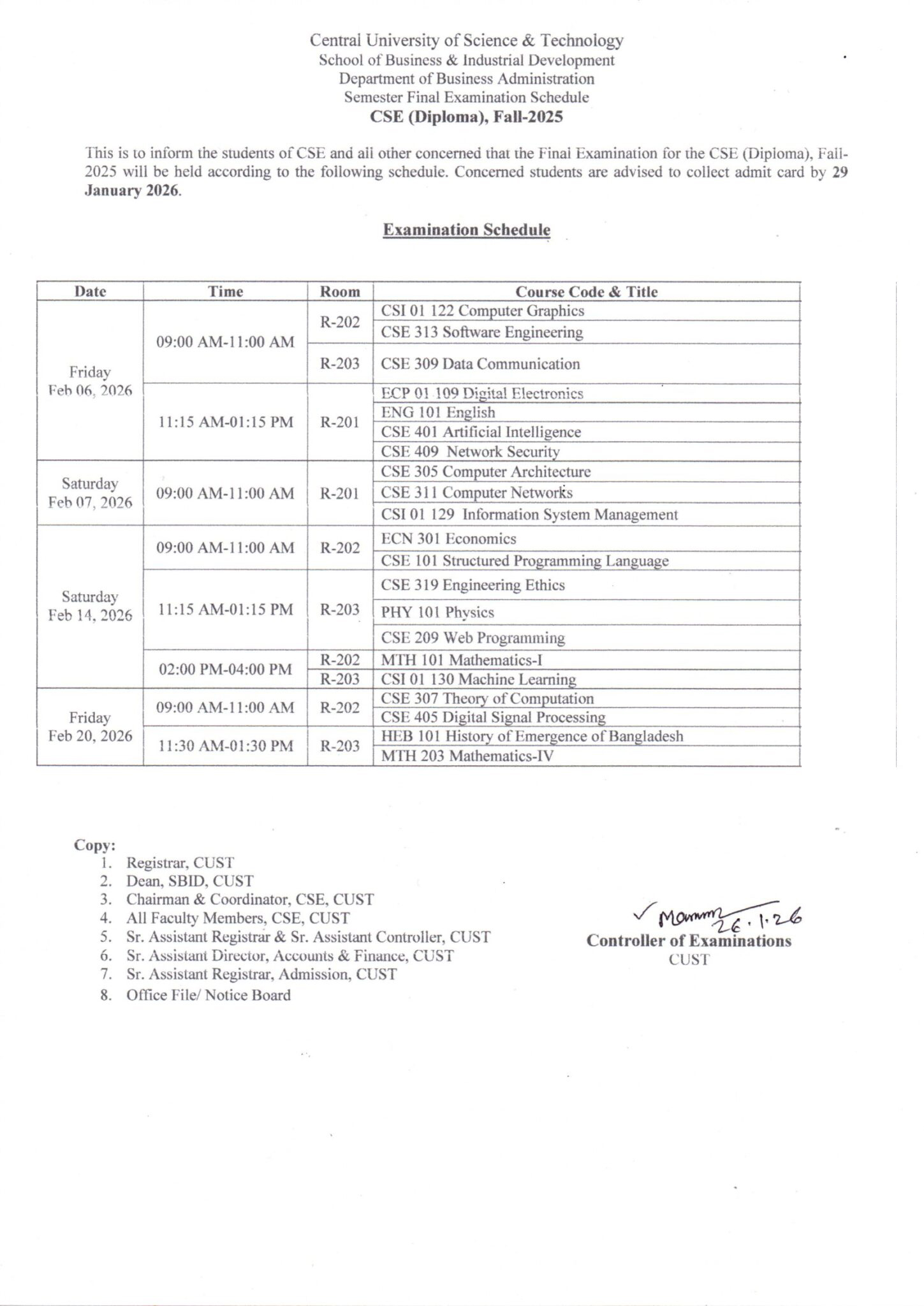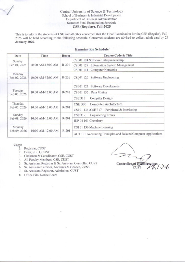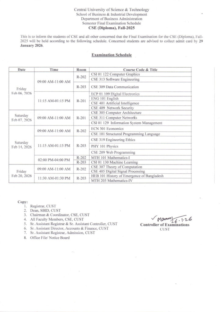 Final Examination Schedule for CSE Program, Fall-2025 January 26, 2026 | Notice . Notice - Computer Science & Engineering