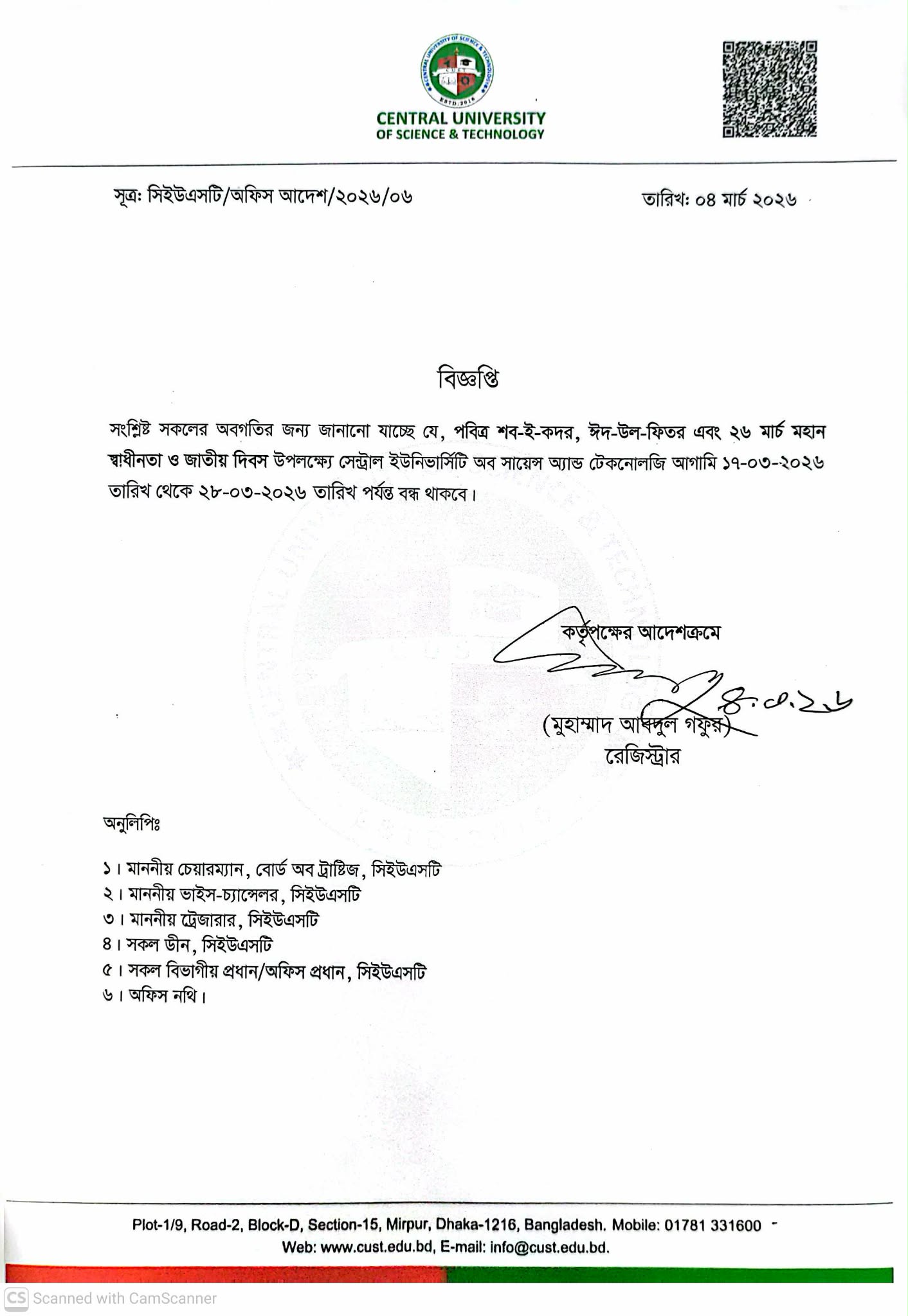 Holidays for Shab-e-Qadr, Jumatul Widha, Eid-ul-Fitr and Independence Day 2026 March 4, 2026 | Notice