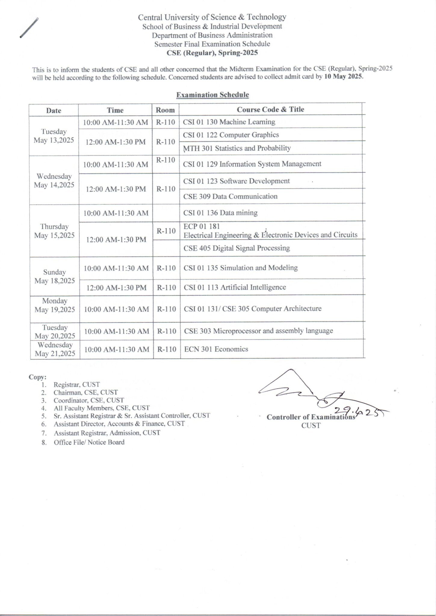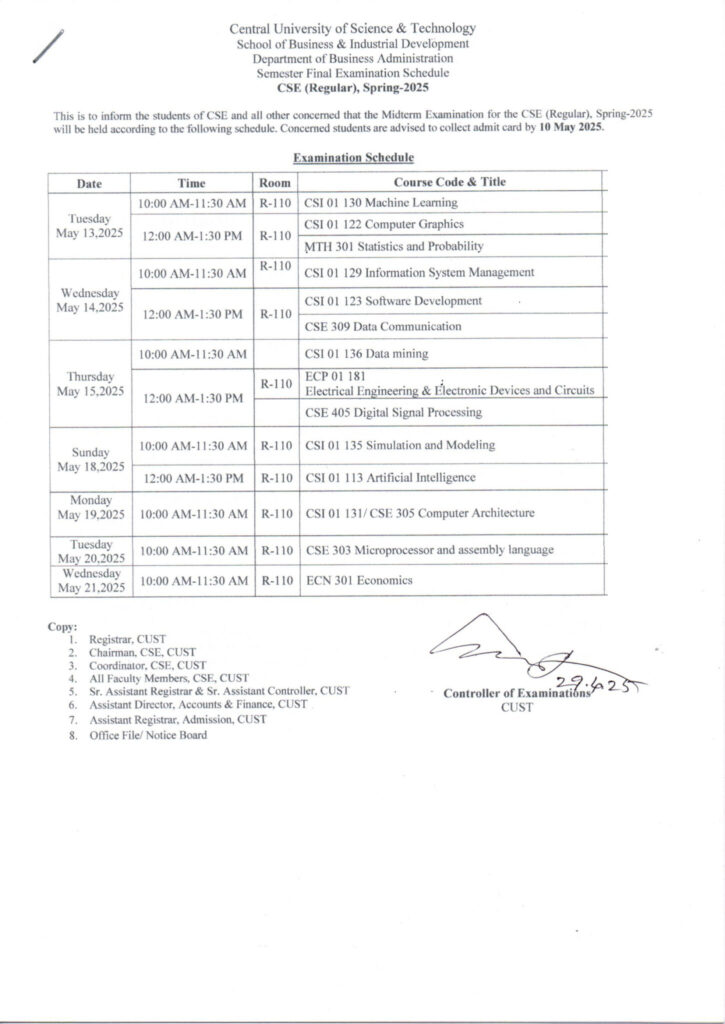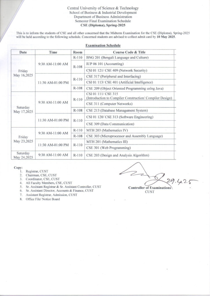 Midterm Examination Schedule for CSE Program, Spring-2025 April 29, 2025 | Notice . Notice - Computer Science & Engineering
